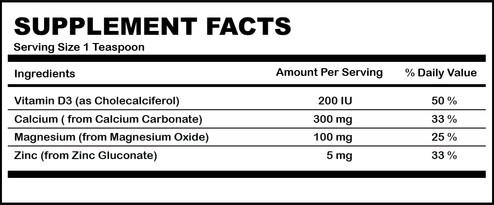 Calcium and Magnesium play essential roles in maintaining bone mineralization. Zinc is essential for cell division and growth. This formulation contains Vitamin D3 to promote calcium absorption. Ca + D3 + Mg + Zn syrup has a pleasant taste and it is suitable for adults and children.